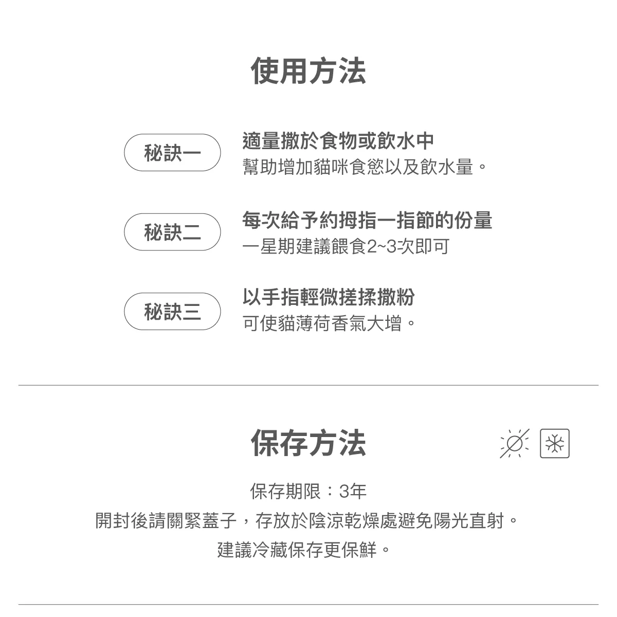 ➤每次給予一小撮即可,約一節拇指量,一星期可使用二至三次。
