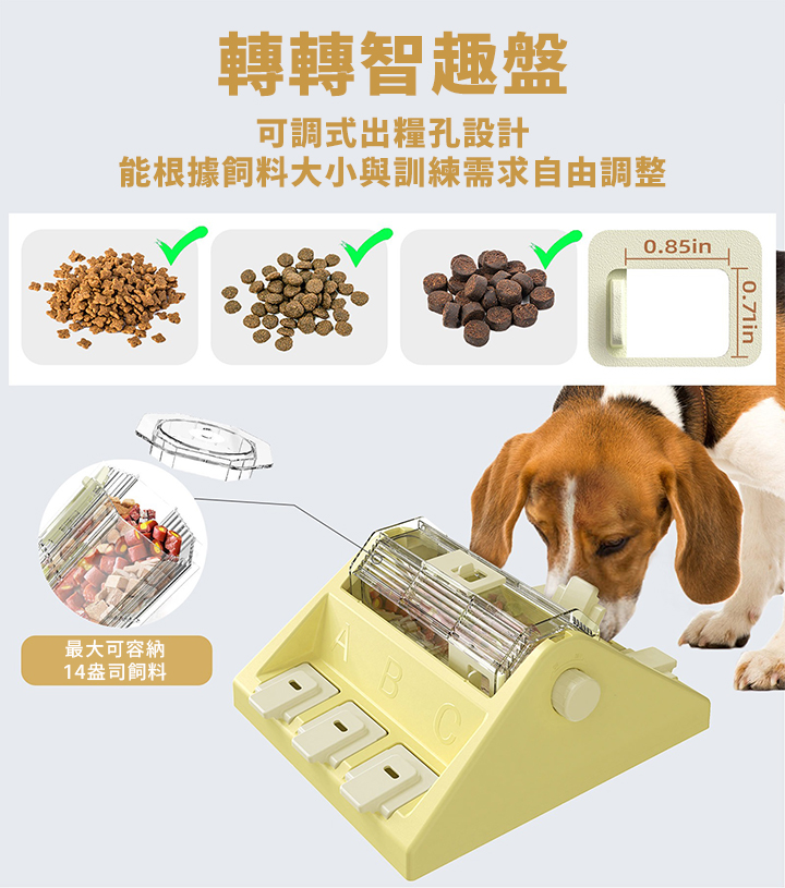 .可調式出糧孔設計,能根據飼料大小與訓練需求自由調製整。