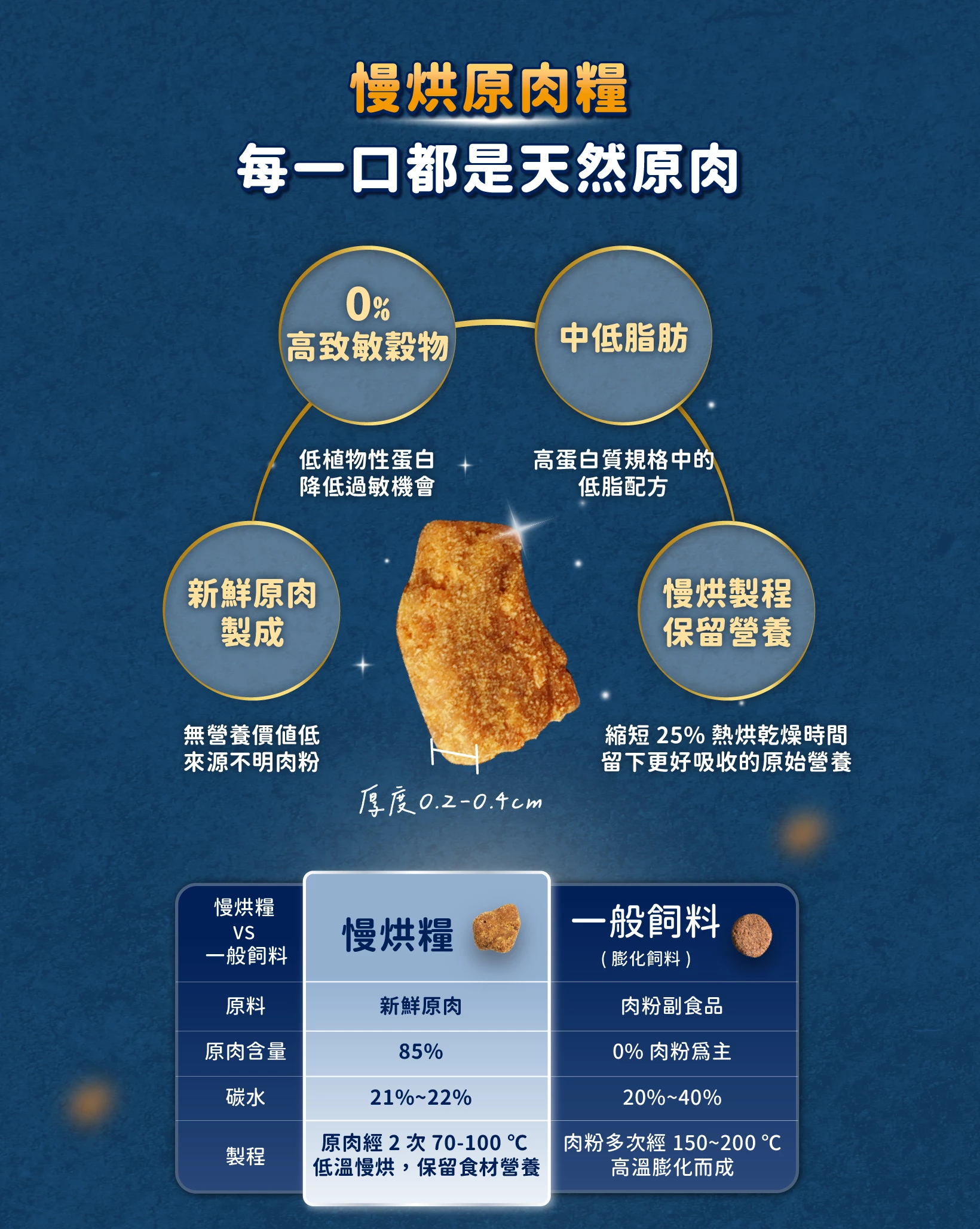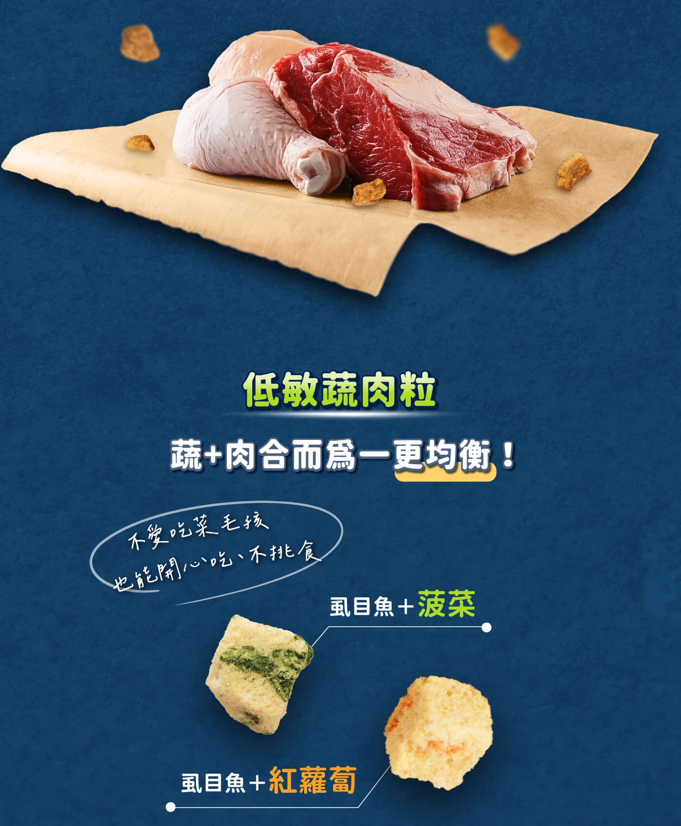 • 慢烘原肉糧+凍乾蔬肉粒,肉菜機能一次滿足!