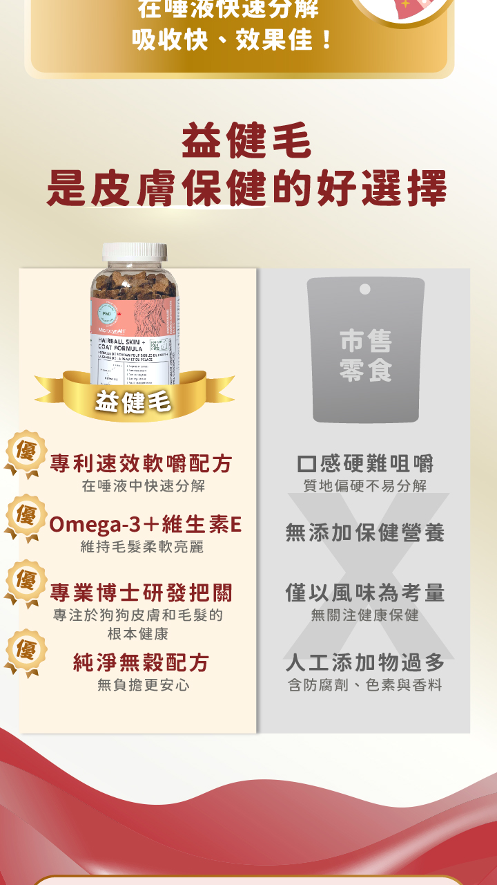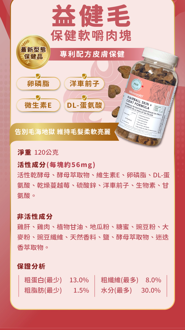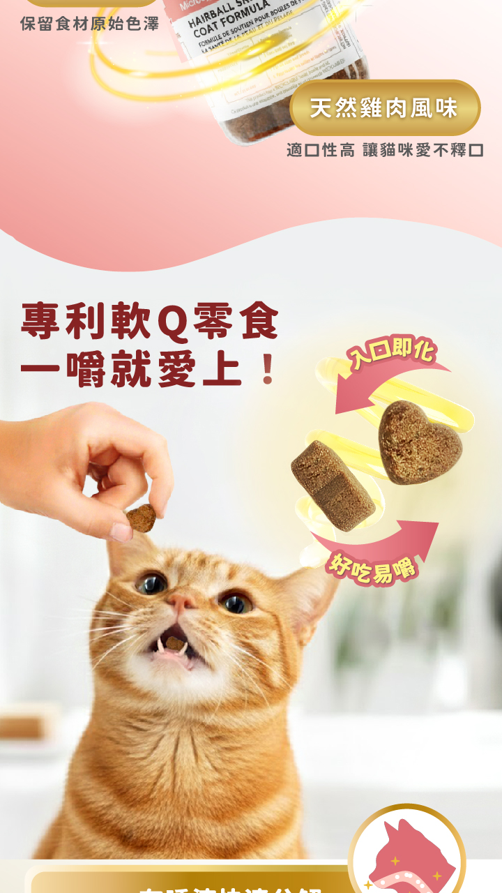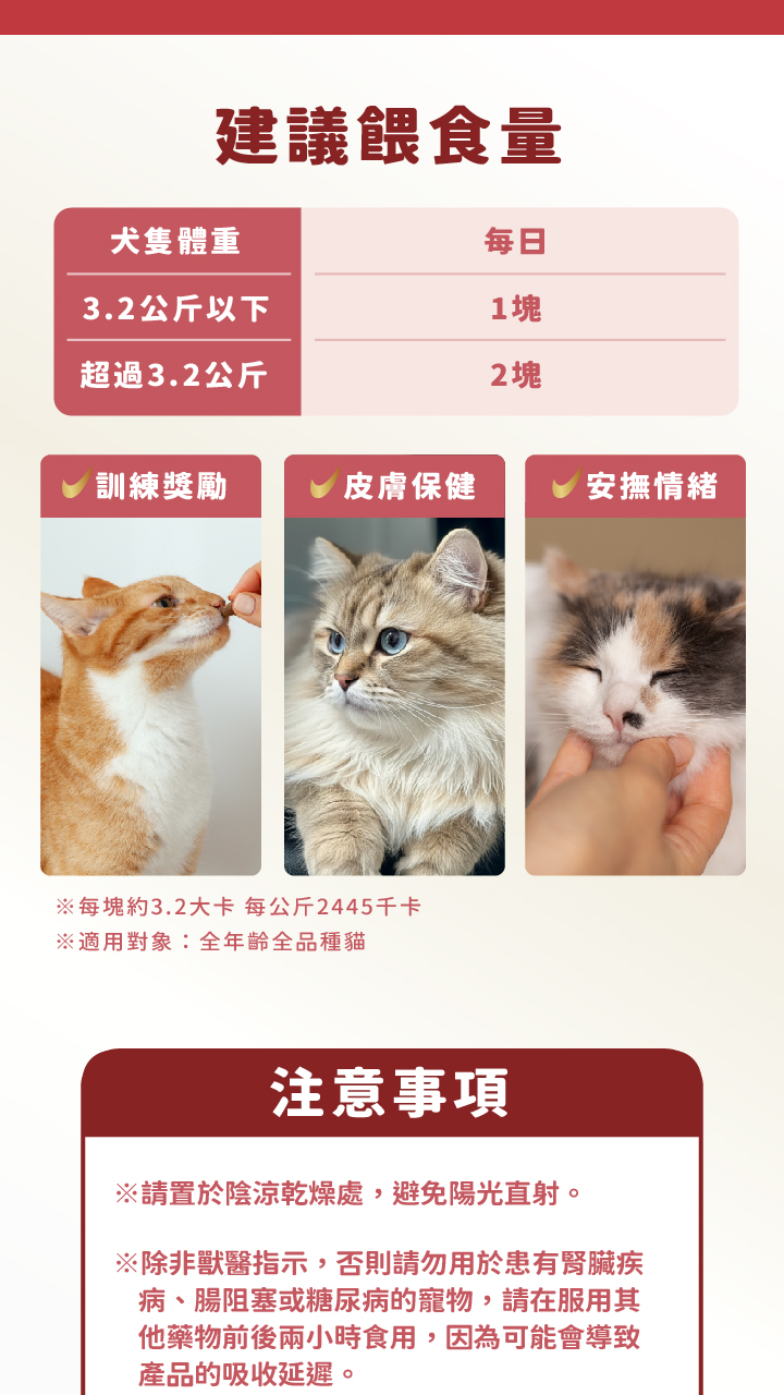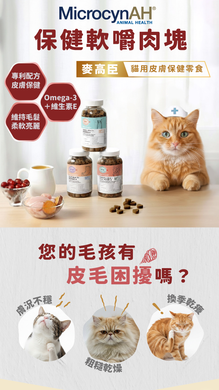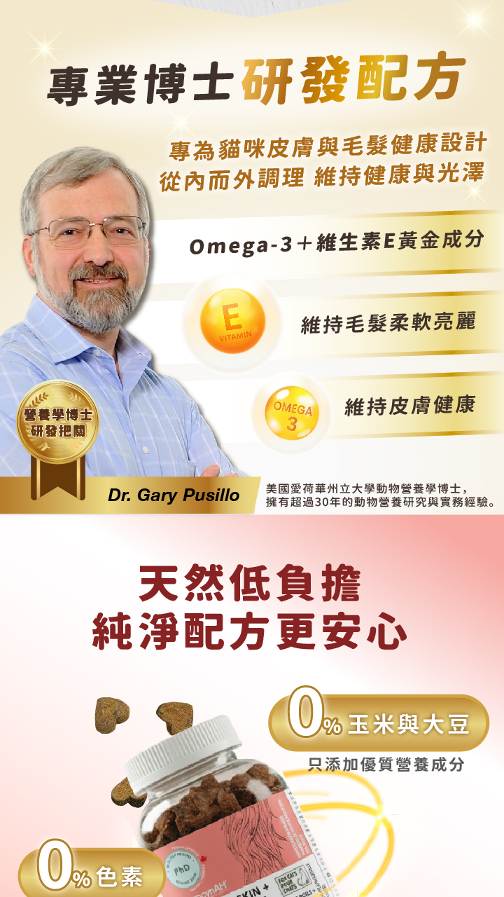 .專利配方貓用皮膚保健Omega-3+維生素E,由內而外調理,維持健康光澤。