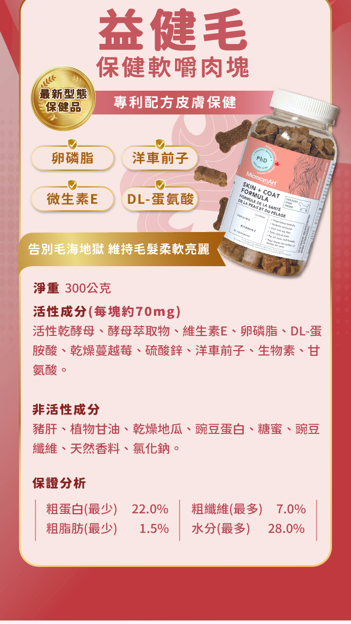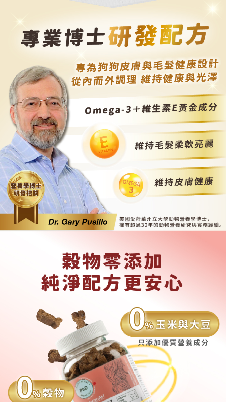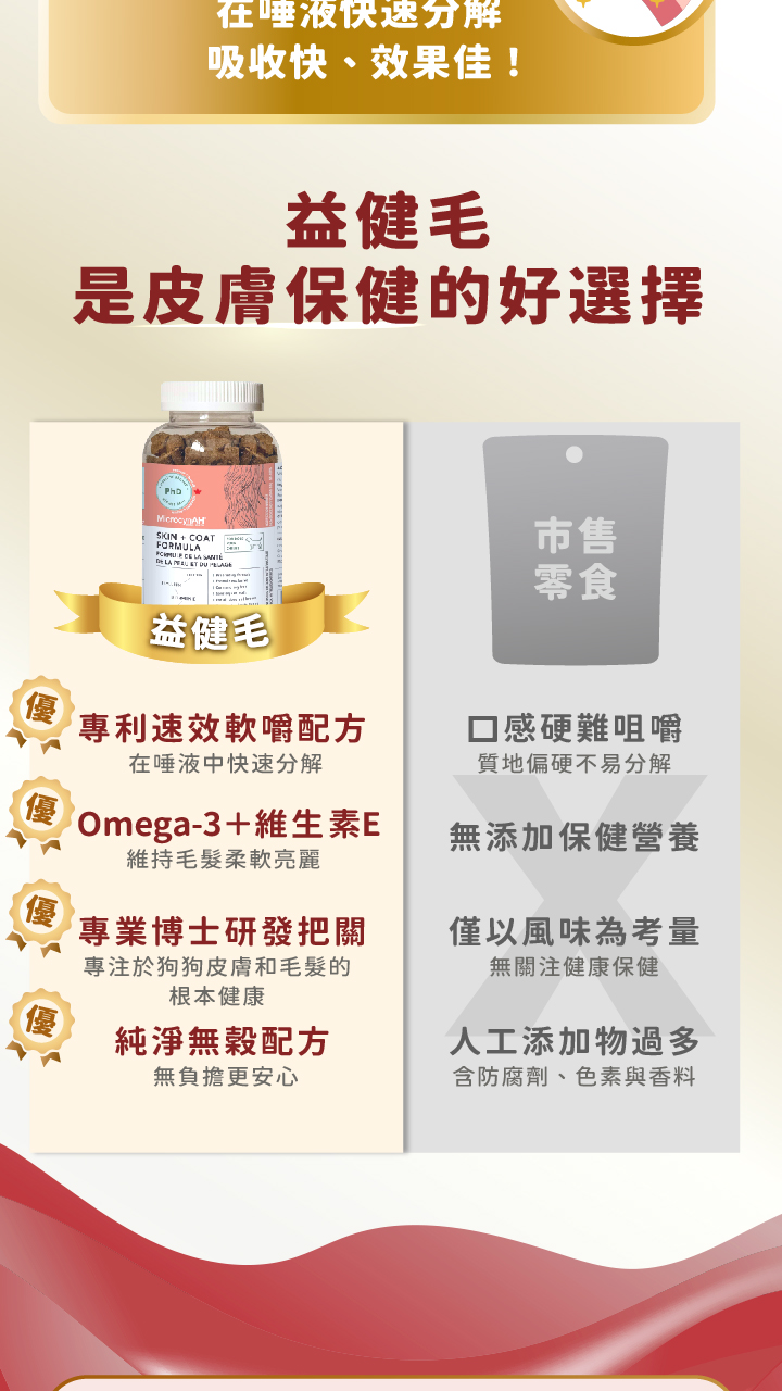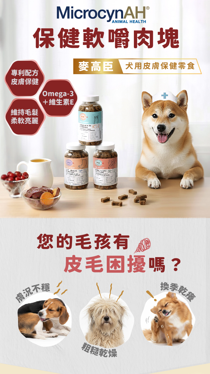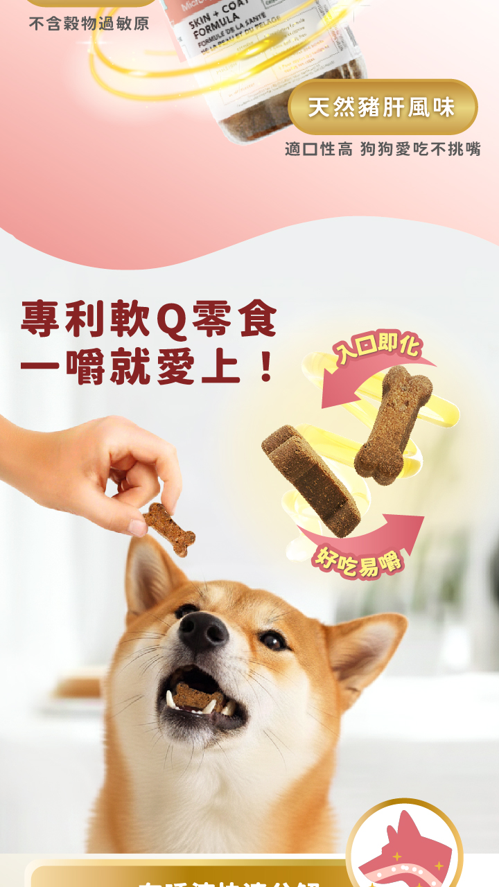 .專利配方犬用皮膚保健Omega-3+維生素E,由內而外調理維持健康光澤。